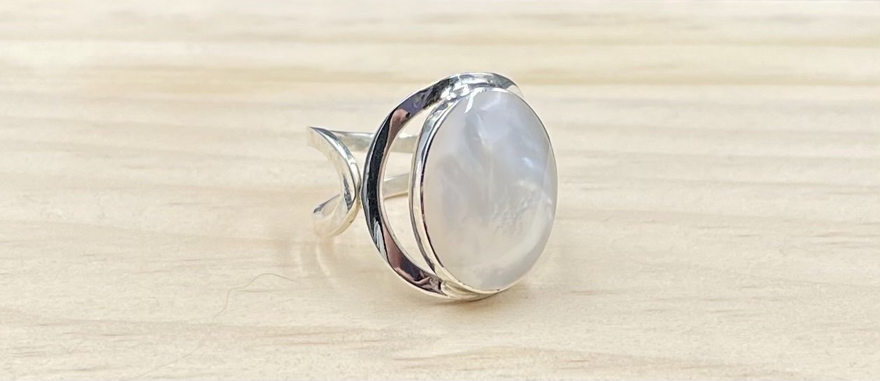 Raffinée et délicate, cette bague réglable en argent 925 est ornée d'une N acre naturelle ovale aux reflets doux et irisés.