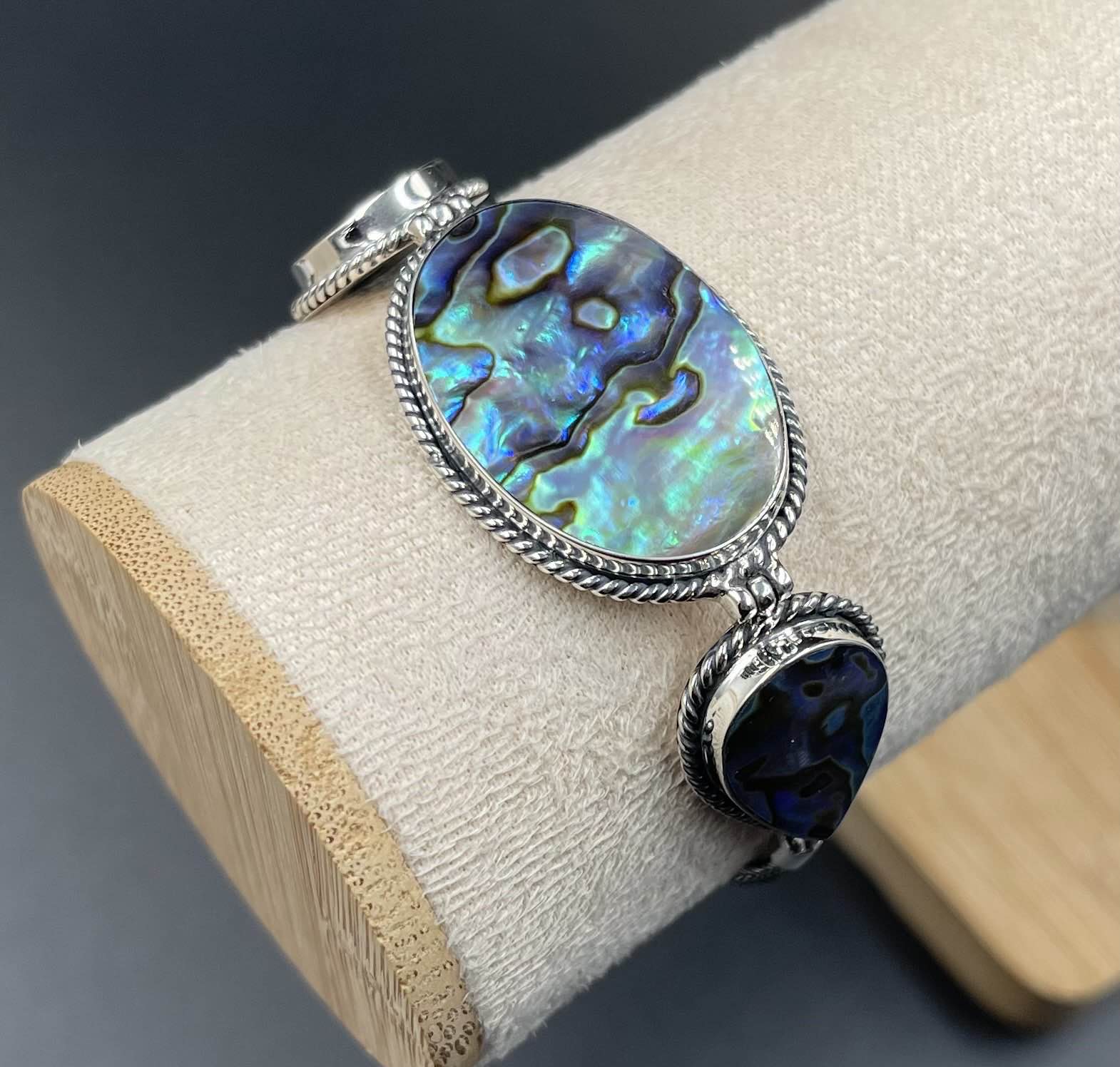 Ce bracelet en argent 925 séduit par son design élégant, mettant en valeur un médaillon ovale sublimé par deux gouttes en coquillage naturel Abalone de chaque côté. Ses nuances chatoyantes de bleu, vert et violet captent la lumière avec éclat, évoquant la beauté mystérieuse de l’océan. Un bijou unique et raffiné.