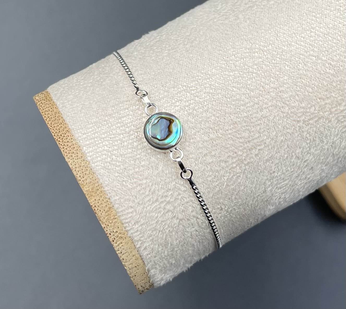 Ce bracelet en argent 925 allie finesse et originalité avec son médaillon rond en coquillage naturel Abalone, sublimé par une chaîne serpent élégante et fluide. Ses nuances chatoyantes de bleu, vert et violet captent la lumière avec éclat, évoquant la beauté mystérieuse de l’océan. Un bijou raffiné et intemporel, parfait pour apporter une touche d’élégance et de singularité à votre poignet.