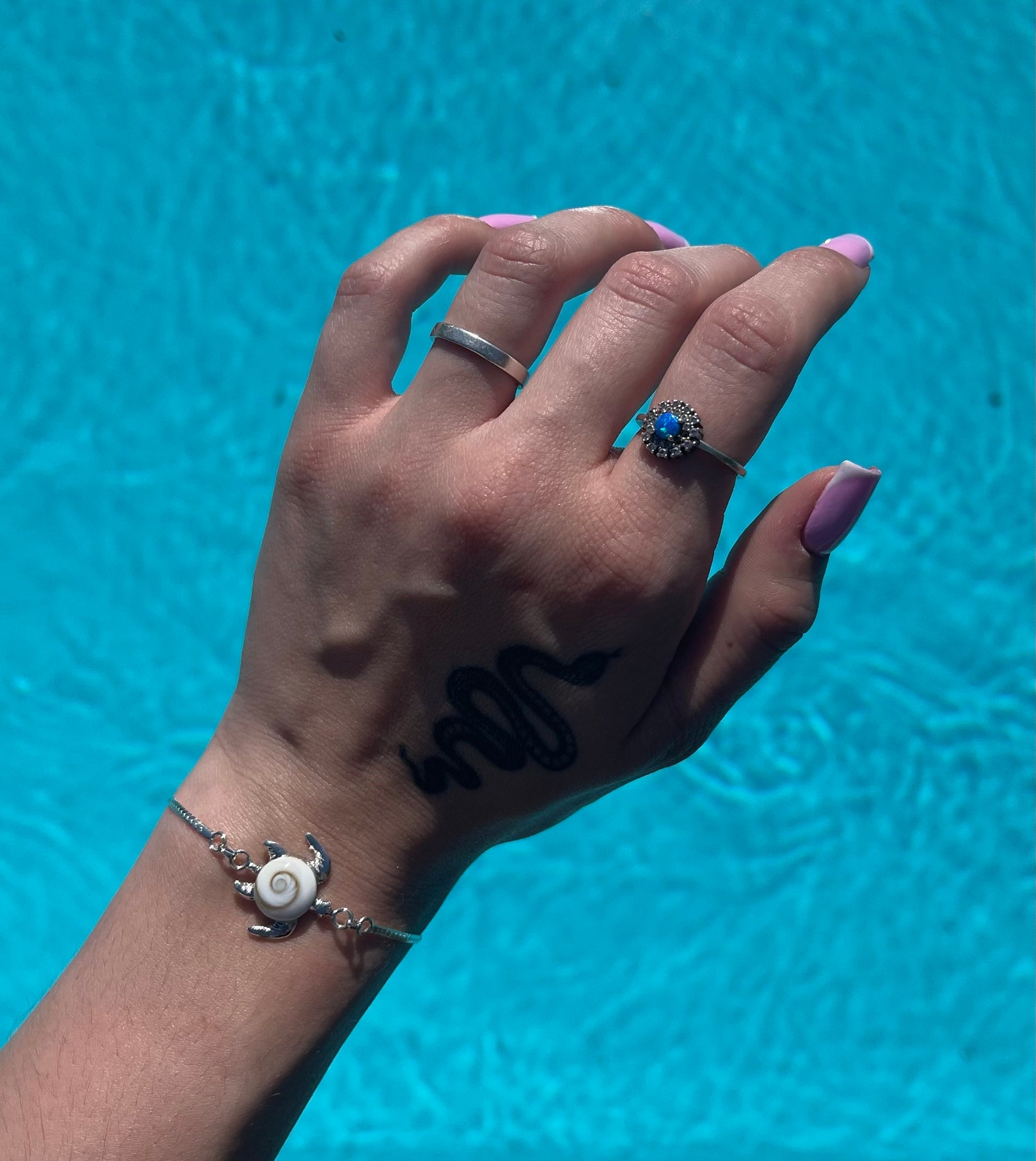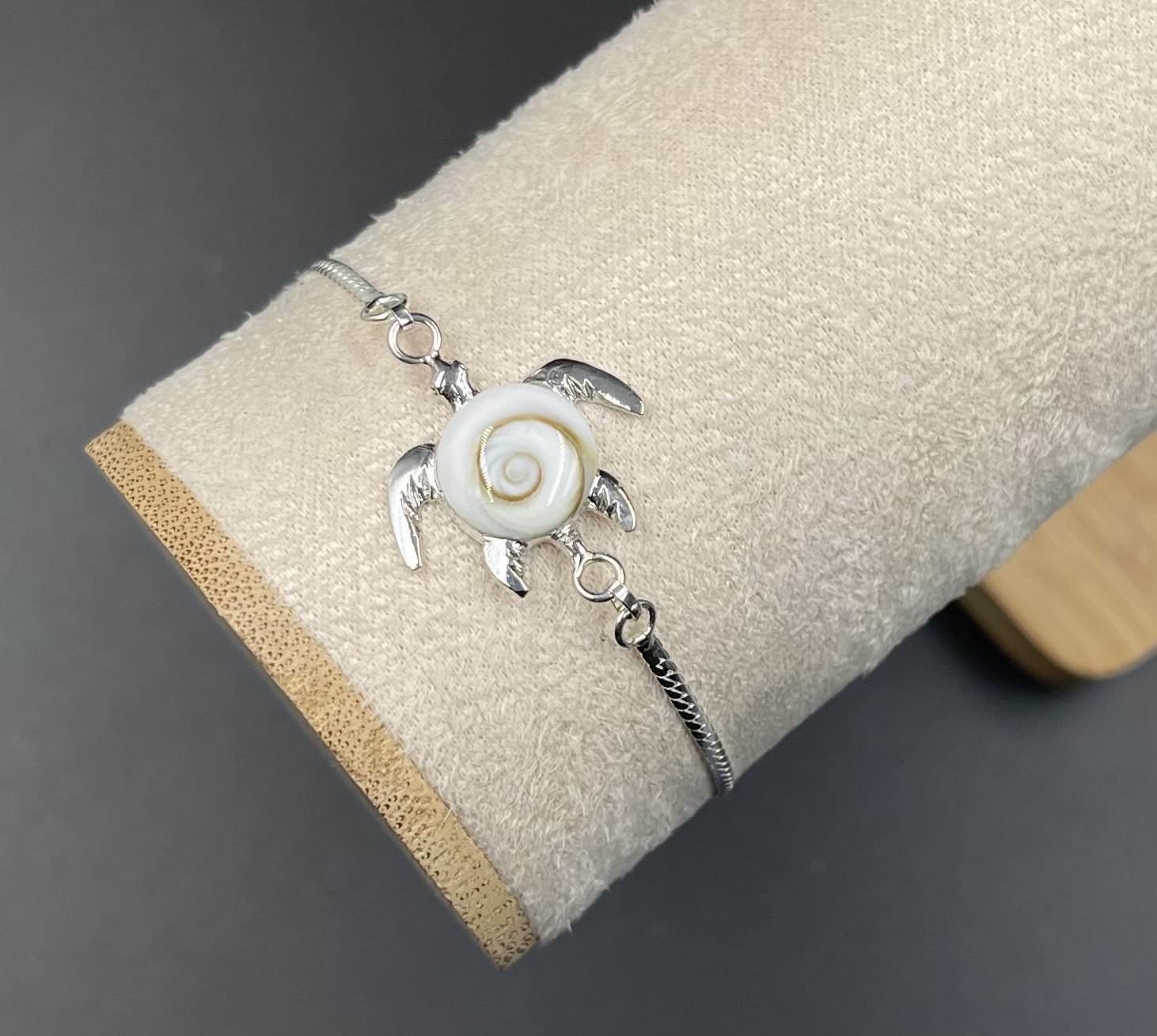 Ce bracelet élégant en argent 925 associe le raffinement de l'argent à la beauté naturelle du coquillage Oeil de Sainte-Lucie. Sa tortue, symbole de sagesse et de longévité, ajoute une touche de charme à ce bijou unique. Parfait pour un look à la fois chic et naturel, il est idéal pour les amoureux de la mer et de la nature. Chaque bracelet est fait main, avec une attention particulière portée à la qualité des matériaux et à l'authenticité des éléments naturels.
