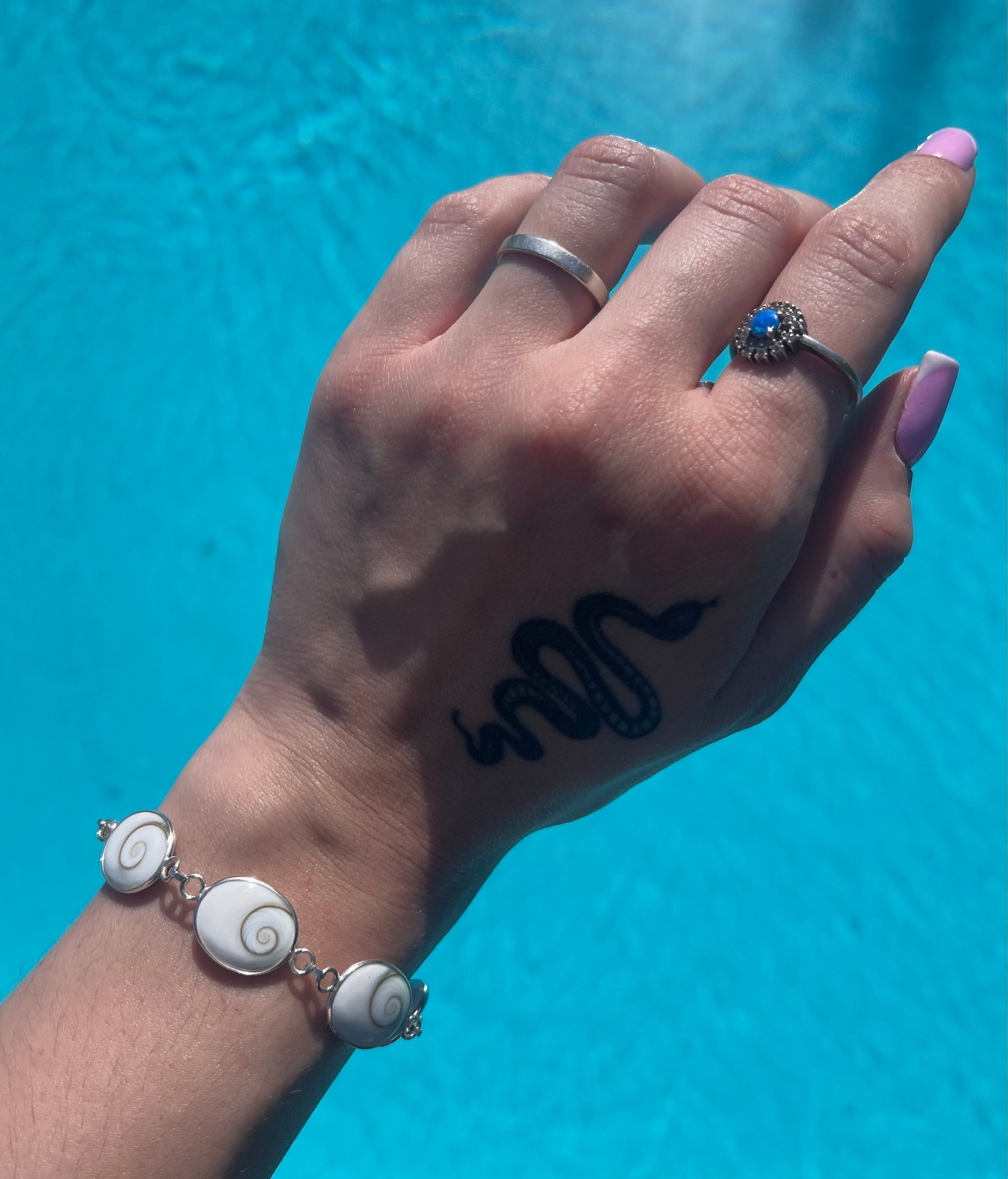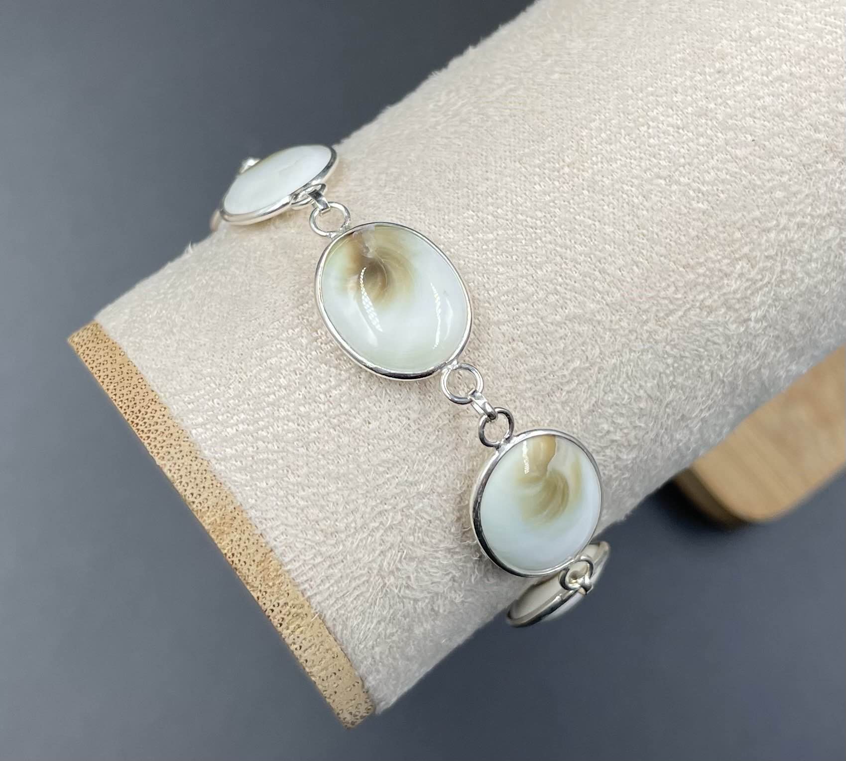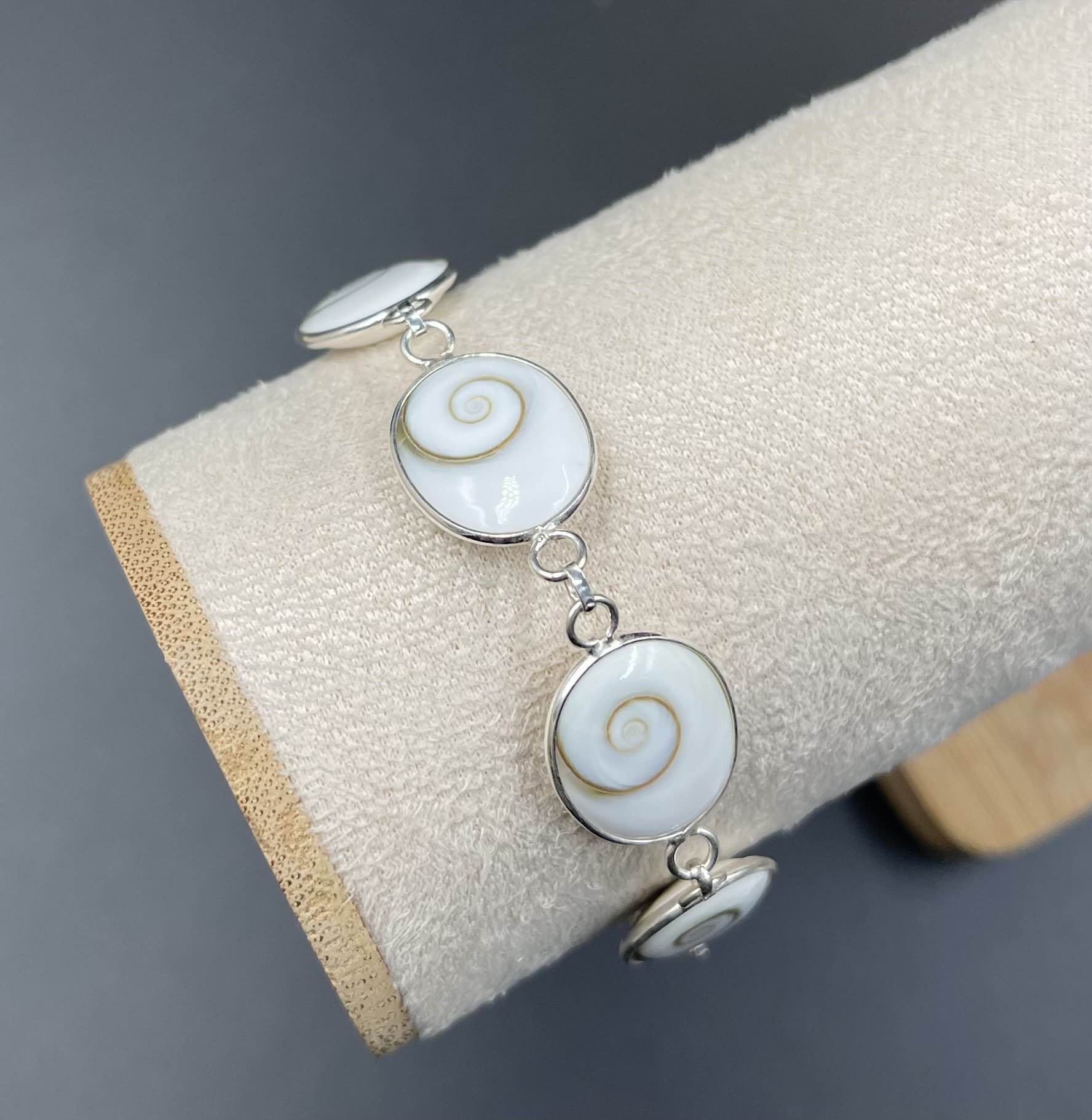 Ce bracelet en argent 925 sublime votre poignet avec une série d’Œils de Sainte-Lucie ovales, disposés tout autour. Véritable porte-bonheur, ce coquillage naturel est réputé pour apporter protection et chance. Son design raffiné et intemporel en fait un bijou unique.