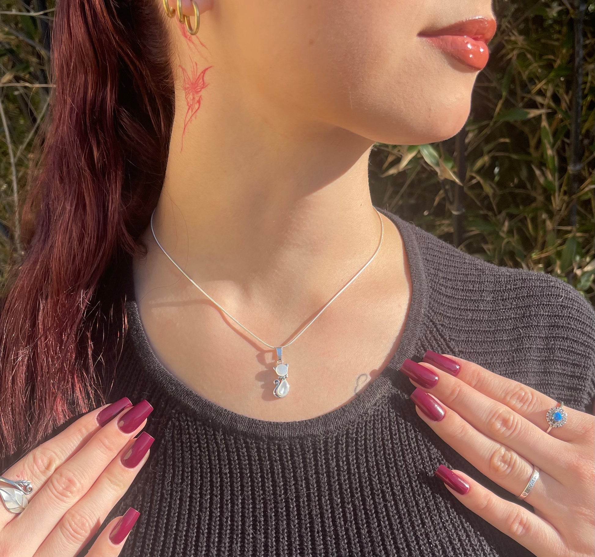 Laissez-vous charmer par ce pendentif en argent 925 en forme de chat, symbole de grâce et de mystère. Son corps est orné d'un délicat coquillage naturel en Nacre , offrant de sublimes reflets irisés qui captent la lumière. Un bijou raffiné et intemporel, idéal pour les amoureux des félins et des pièces uniques.
