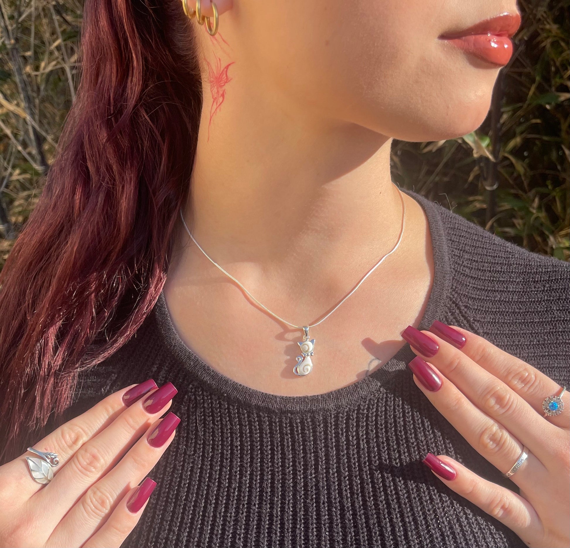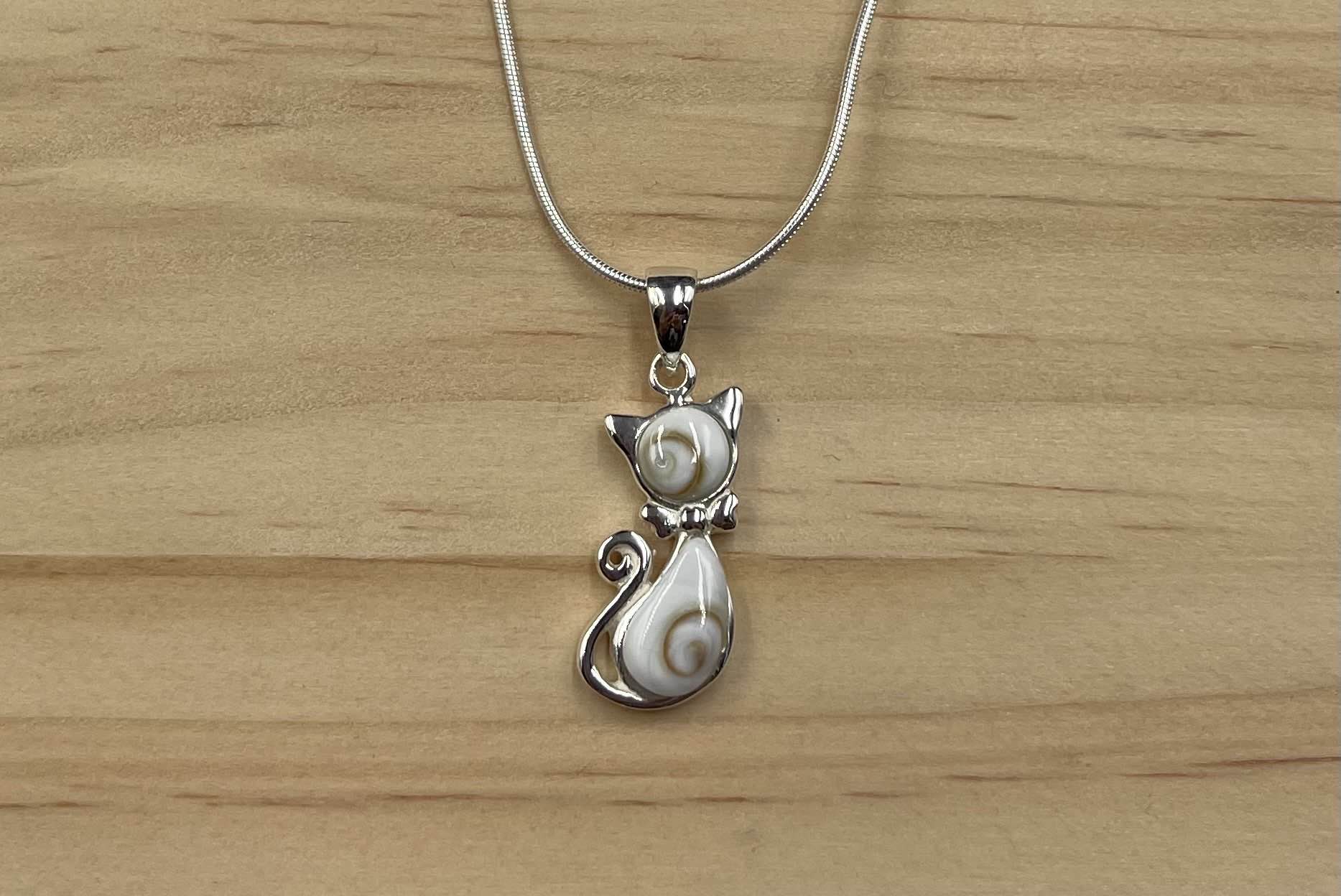 Ce magnifique pendentif en argent 925 représente un chat raffiné, symbole de mystère et d'indépendance. Son centre est sublimé par un coquillage naturel Œil de Sainte-Lucie , réputé pour porter chance et protection. Un bijou élégant et original, parfait pour les amoureux des félins et des talismans porte-bonheur.