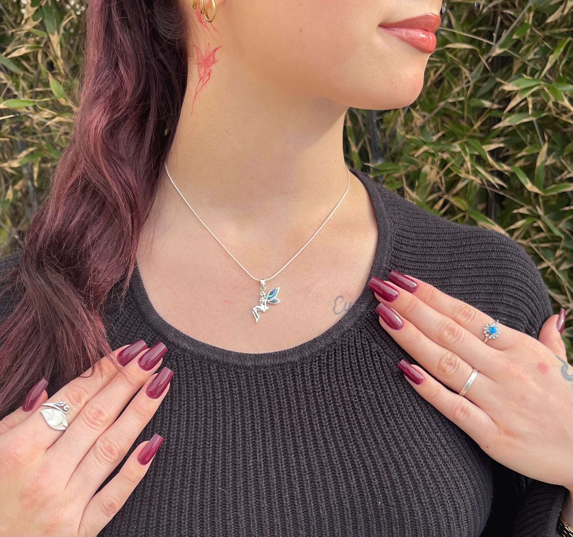 Laissez-vous envoûter par ce magnifique pendentif en argent 925 représentant une fée élégante aux ailes ornées de coquillage naturel Abalone. Ses reflets irisés captent la lumière et évoquent la magie de la nature. Un bijou féerique et raffiné, idéal pour celles qui aiment les symboles de liberté et de mystère.
