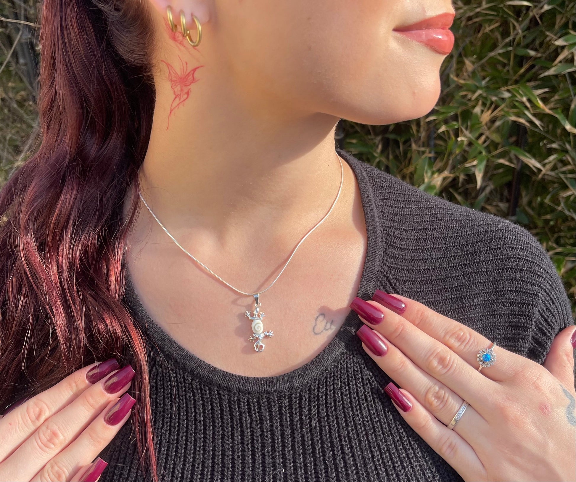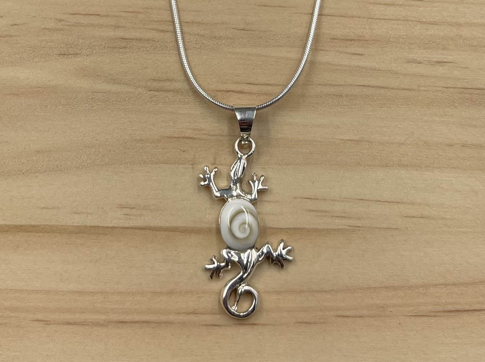 Ce pendentif en argent 925 représente une salamandre, symbole du renouveau et d'adaptabilité, ornée d'un élégant médaillon ovale en coquillage naturel Œil de Sainte-Lucie . Connu pour porter chance et protection, cet œil unique ajoute une touche mystique et naturelle à ce bijou raffiné. Un accessoire intemporel, idéal pour ceux qui recherchent l'élégance et le symbolisme puissant.